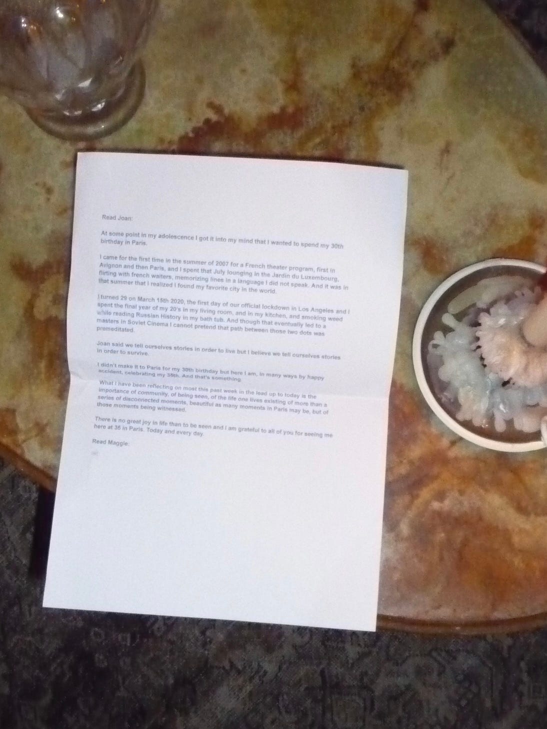 What I have been reflecting on most this past week in the lead up to today is the importance of community, of being seen, of the life one lives existing of more than a series of disconnected moments, beautiful as many moments in Paris may be, but of those moments being witnessed.